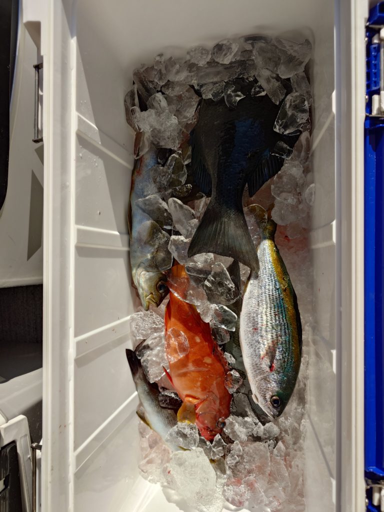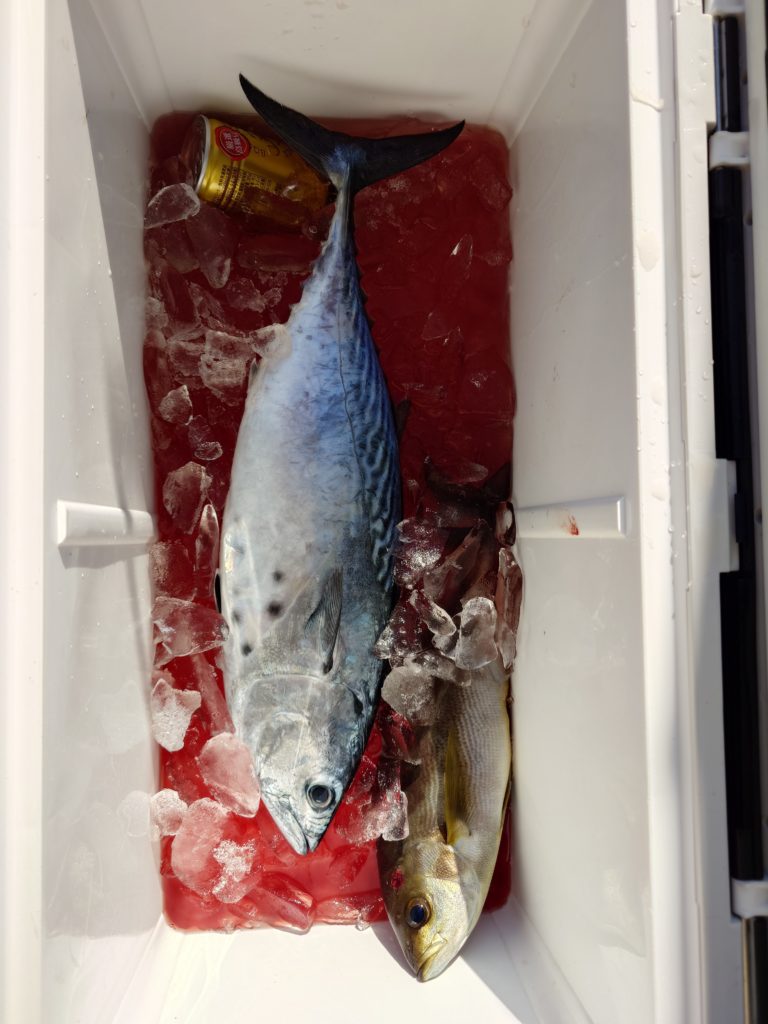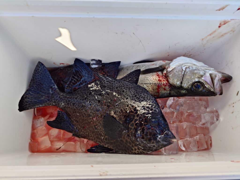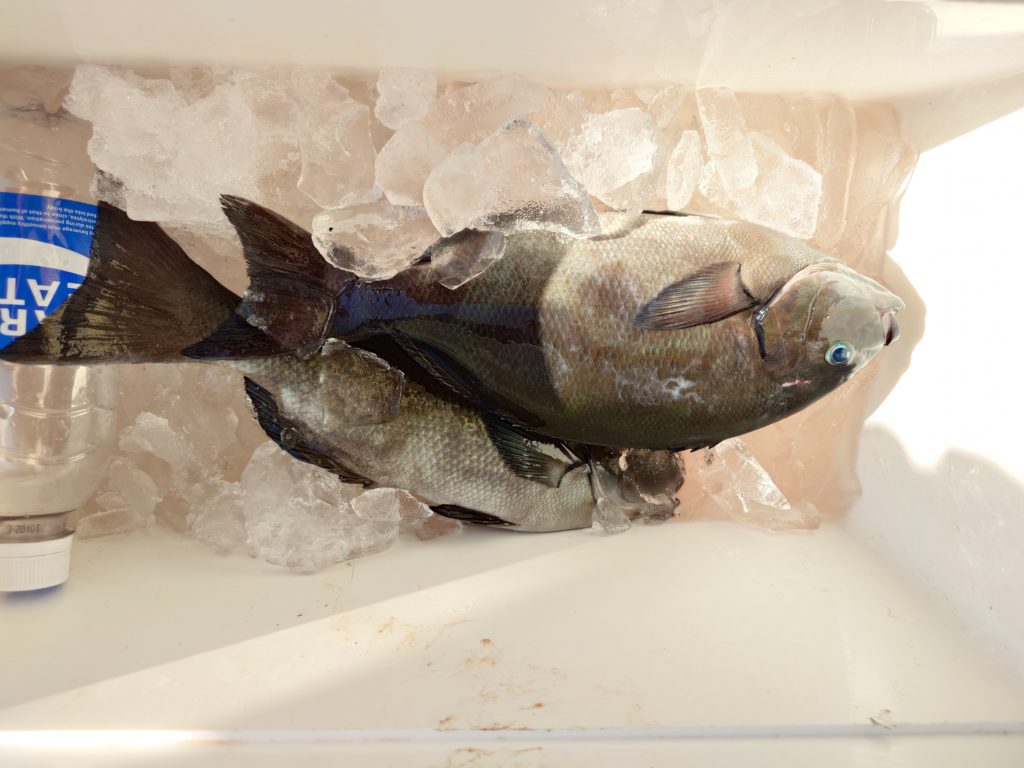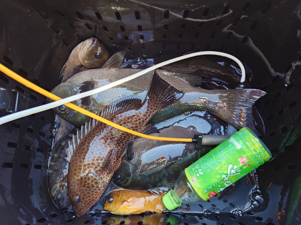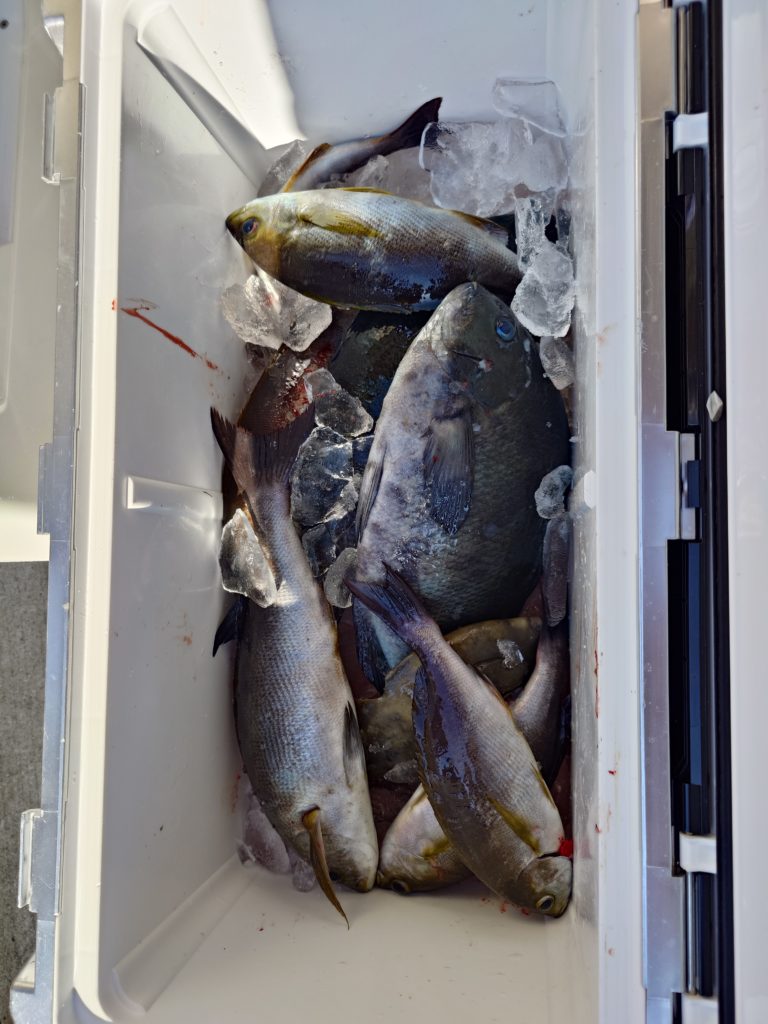 本日の釣果です🐟️サメに邪魔されながらポロポロとグレ、イサキと釣れてました。水温は22度前半